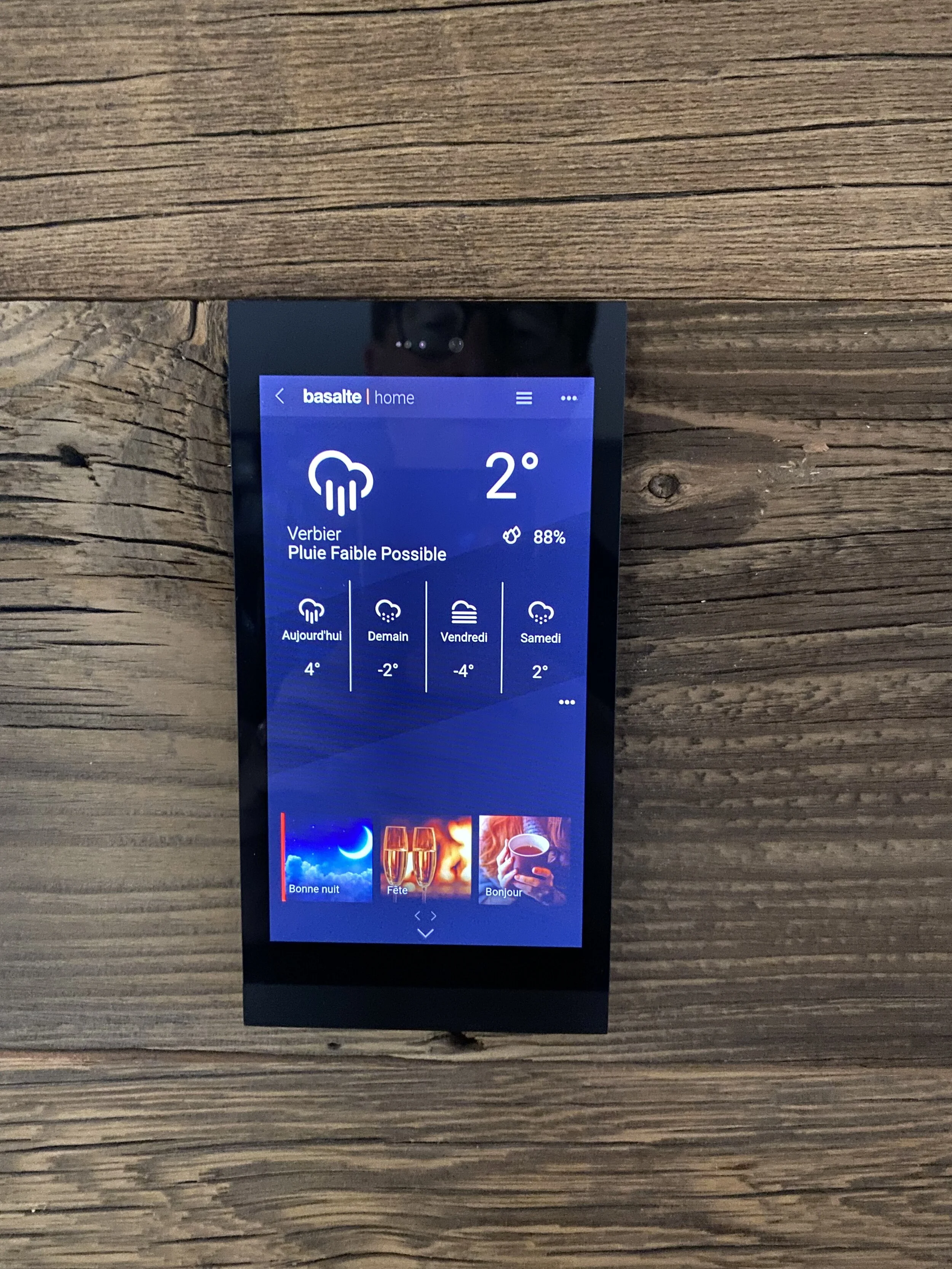 Ellie est un écran tactile élégant pour Basalte Home. Contrôler les lumières, le climat, la musique et plus encore dans la maison. Un design fin avec une dimension de seulement (h:155mm x larg.80mm x Ep:10mm) et sa finition haut de gamme pour votre Smart Home .